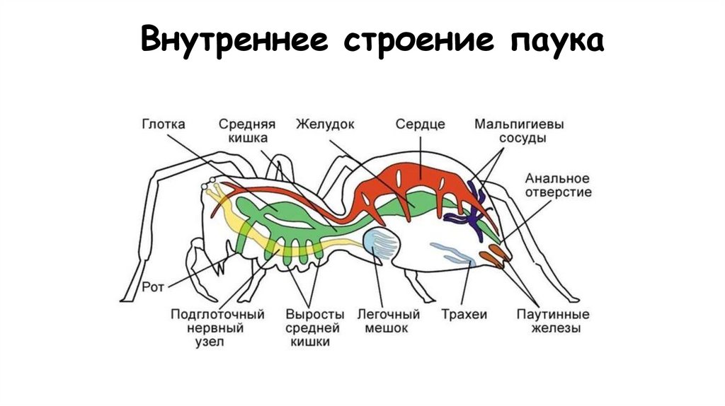 Внутреннее строение паука7. Клещи 1.не более 1 мм 2.слияние всех отделов тела 3.разные ротовые аппараты 4.распространены почти везде (в основном почва,