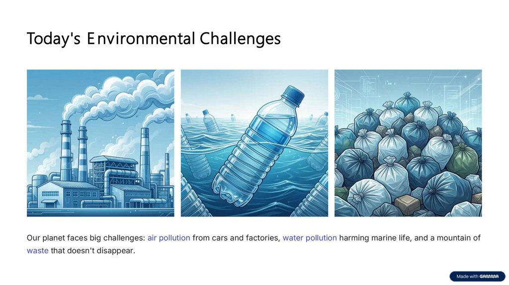 Today's E nvironmental ChallengesOur planet faces big challenges: air pollution from cars and factories, water pollution harming marine life, and a mountain of