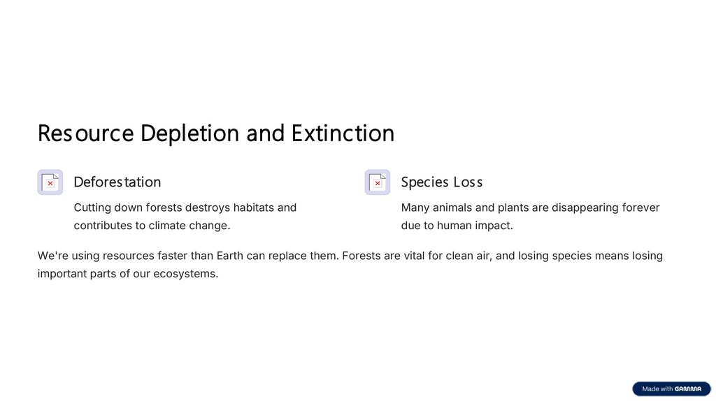We're using resources faster than Earth can replace them. Forests are vital for clean air, and losing species means losing