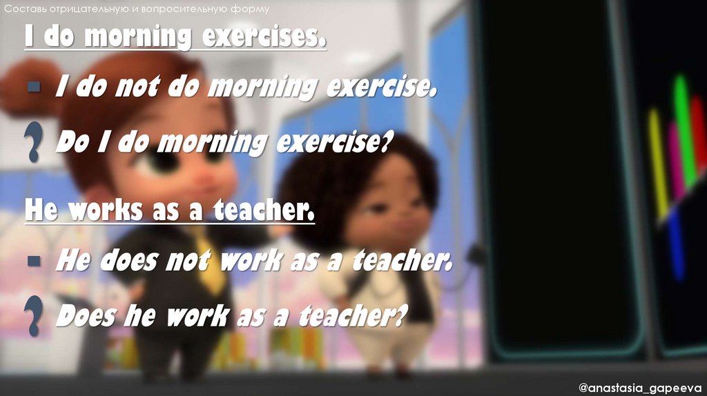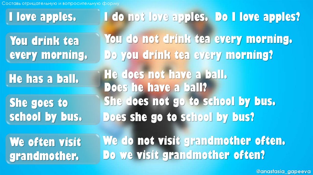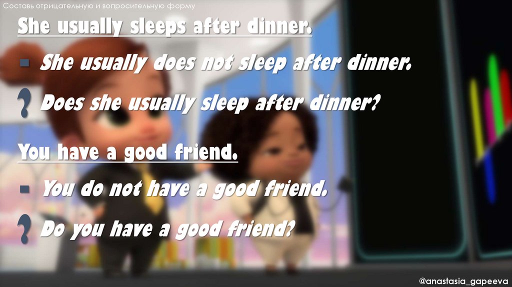 Составь отрицательную и вопросительную формуShe usually sleeps after dinner.