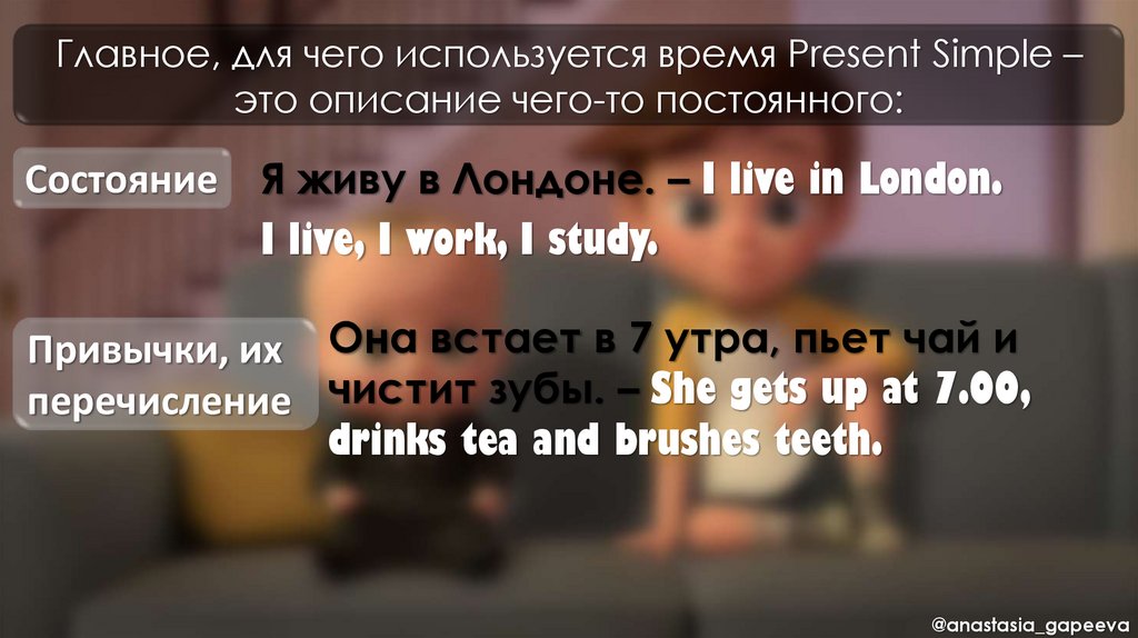 Главное, для чего используется время Present Simple –это описание чего-то постоянного: