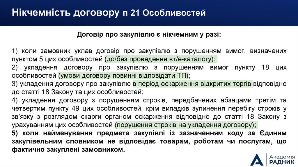 Нікчемність договору п 21 ОсобливостейДоговір про закупівлю є нікчемним у разі: