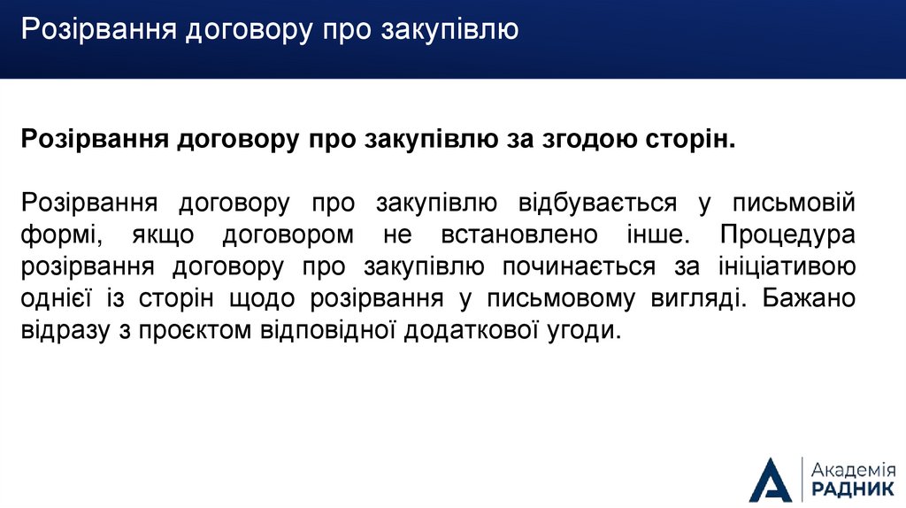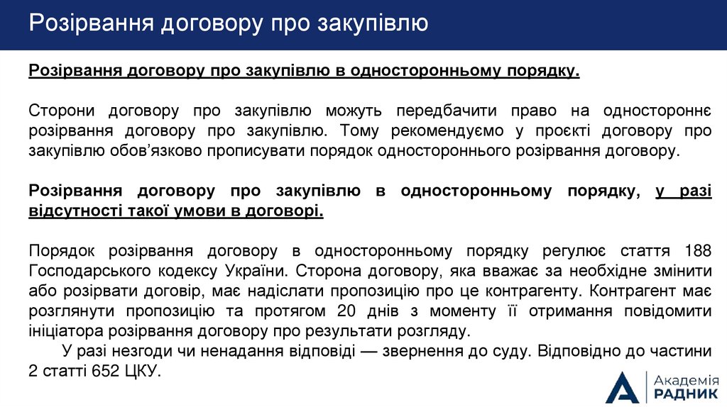 закупівлю обов’язково прописувати порядок одностороннього розірвання договору.