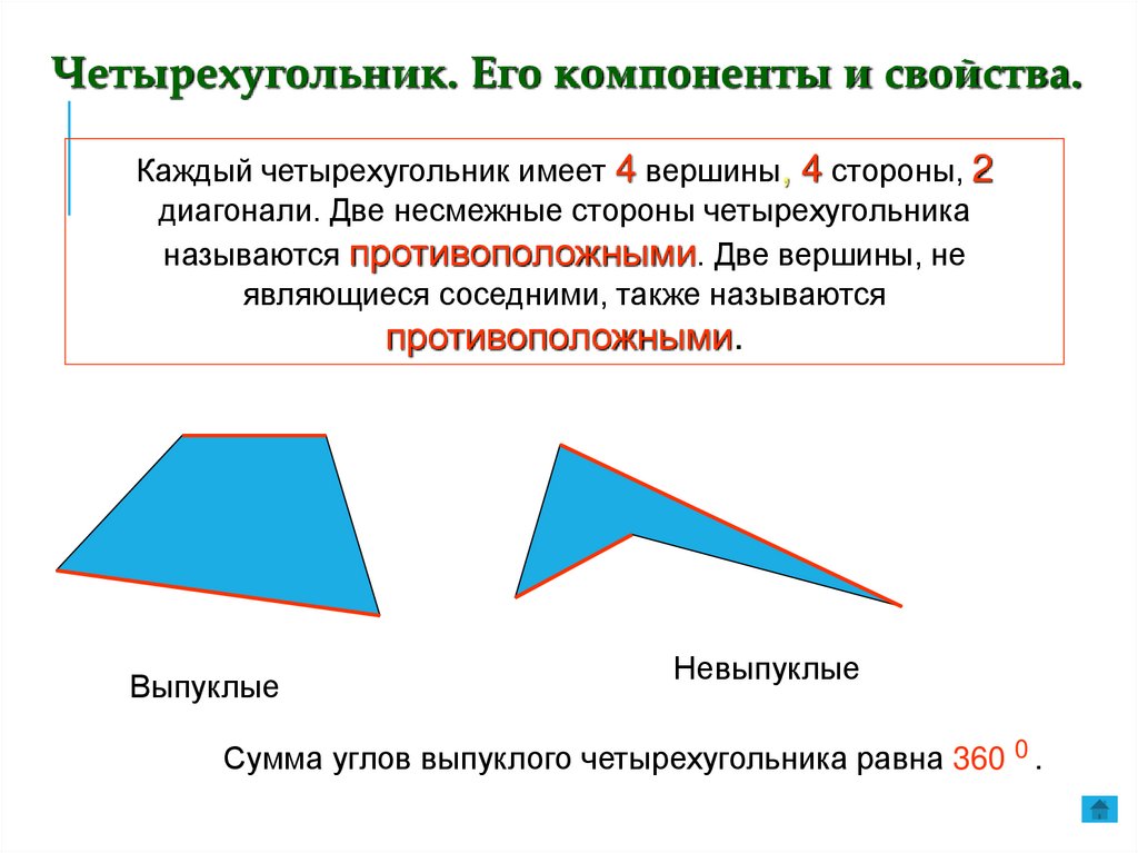 Четырехугольник. Его компоненты и свойства.Каждый четырехугольник имеет 4 вершины, 4 стороны, 2