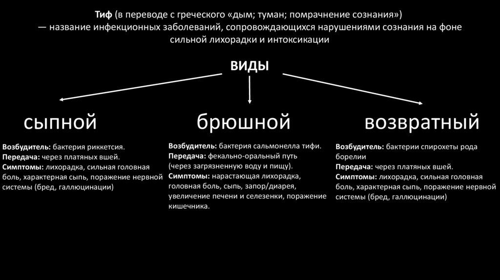 Тиф (в переводе с греческого «дым; туман; помрачнение сознания»)— название инфекционных заболеваний, сопровождающихся нарушениями сознания на фоне