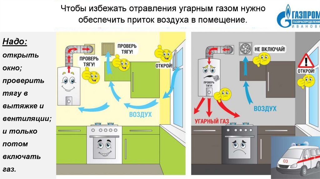 Чтобы избежать отравления угарным газом нужнообеспечить приток воздуха в помещение.