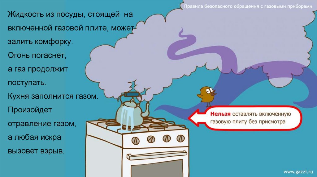 Жидкость из посуды, стоящей навключенной газовой плите, может