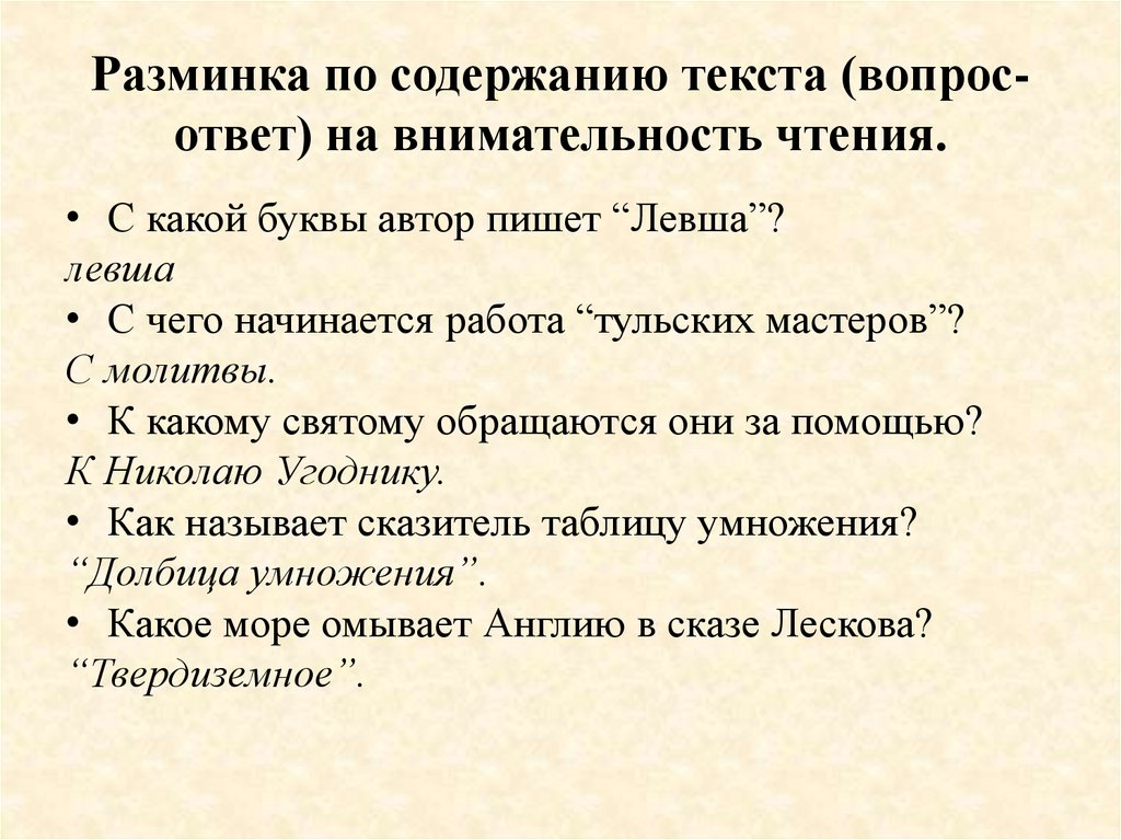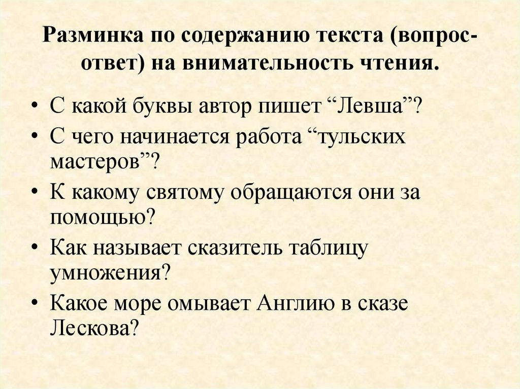 Разминка по содержанию текста (вопросответ) на внимательность чтения.• С какой буквы автор пишет “Левша”?