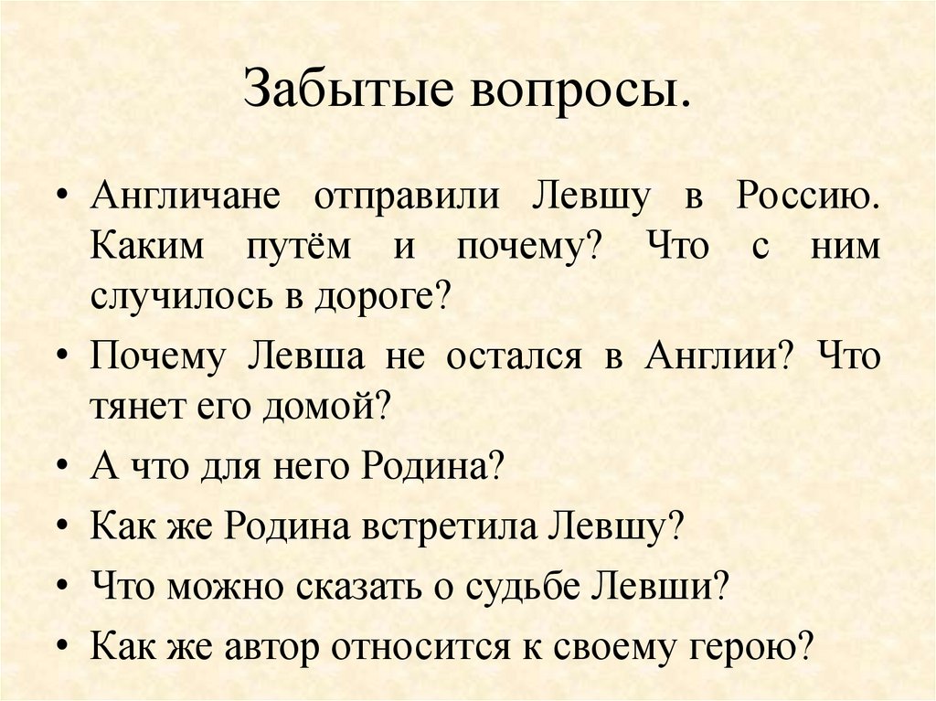 Забытые вопросы.• Англичане отправили Левшу в Россию.