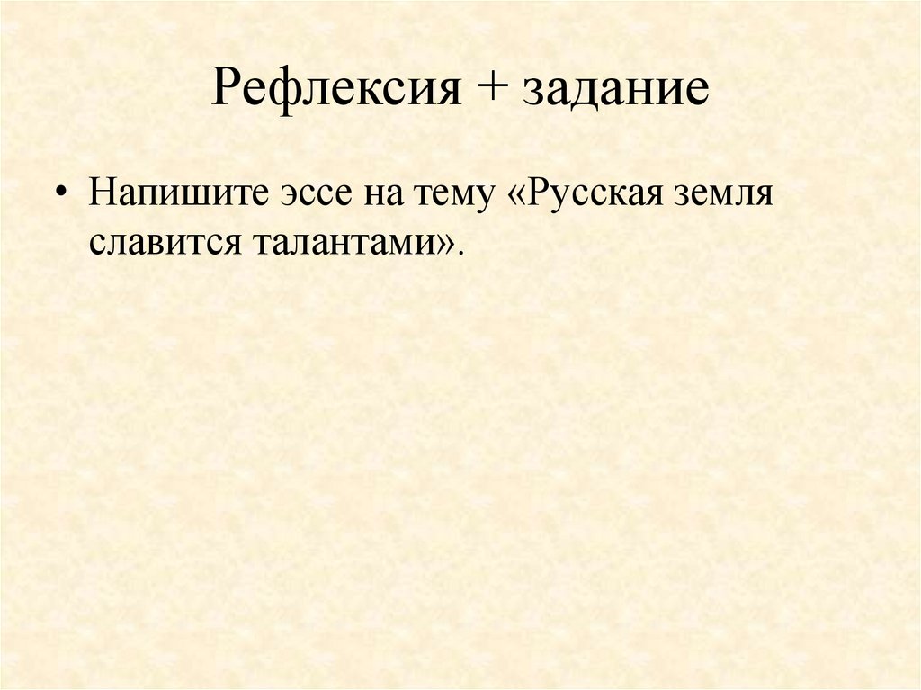 Рефлексия + задание• Напишите эссе на тему «Русская земля