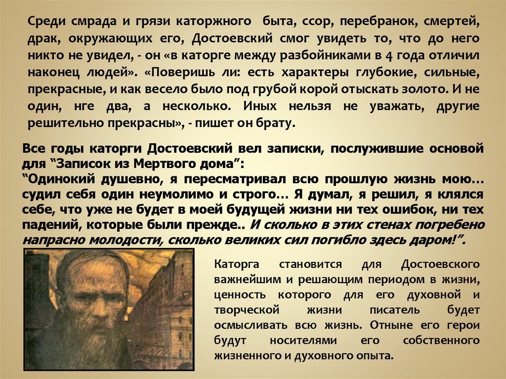 Среди смрада и грязи каторжного быта, ссор, перебранок, смертей,драк, окружающих его, Достоевский смог увидеть то, что до него