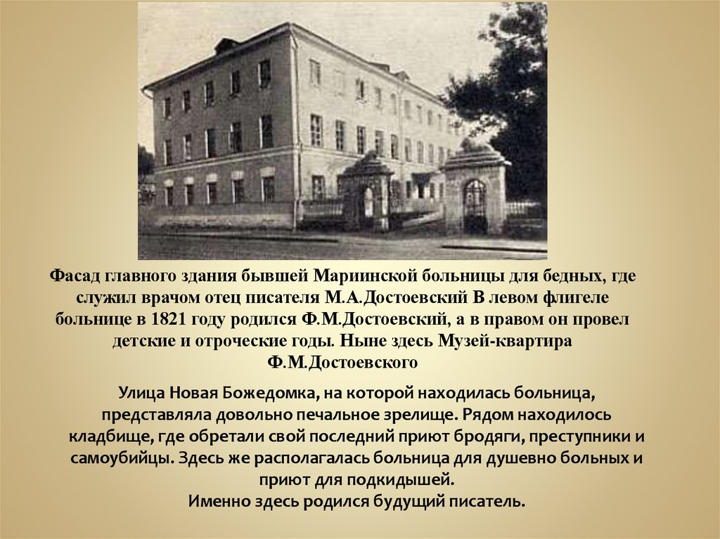 больнице в 1821 году родился Ф.М.Достоевский, а в правом он провел