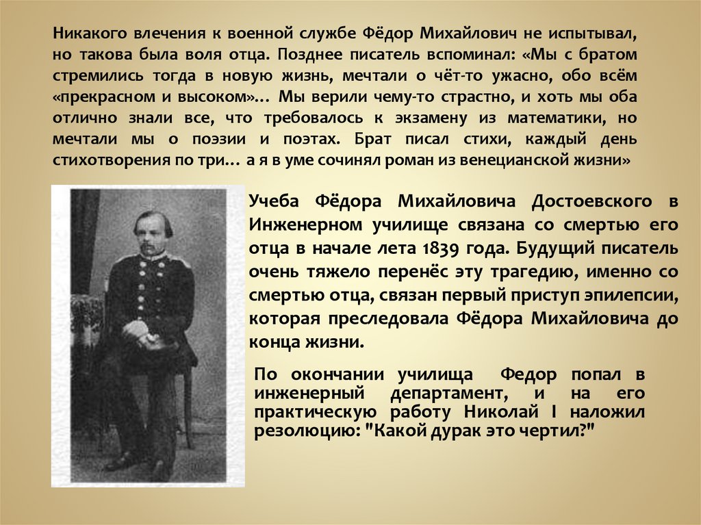 Никакого влечения к военной службе Фёдор Михайлович не испытывал,но такова была воля отца. Позднее писатель вспоминал: «Мы с братом
