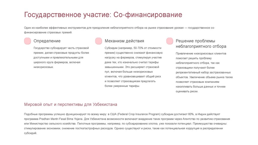 Роль государства: Активное участие государства через программы со-финансирования страховых премий и механизмы перестрахования