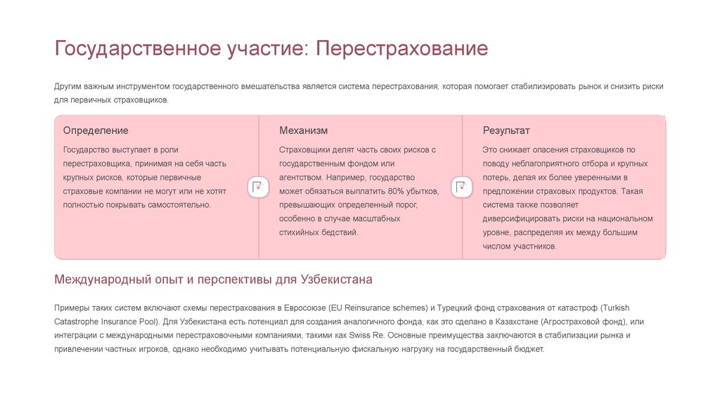 Государственное участие: ПерестрахованиеДругим важным инструментом государственного вмешательства является система перестрахования, которая помогает стабилизировать рынок и снизить риски