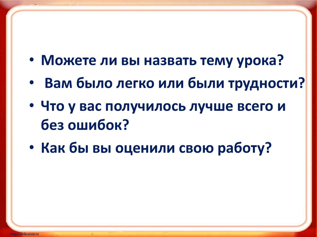 • Можете ли вы назвать тему урока?• Вам было легко или были трудности?