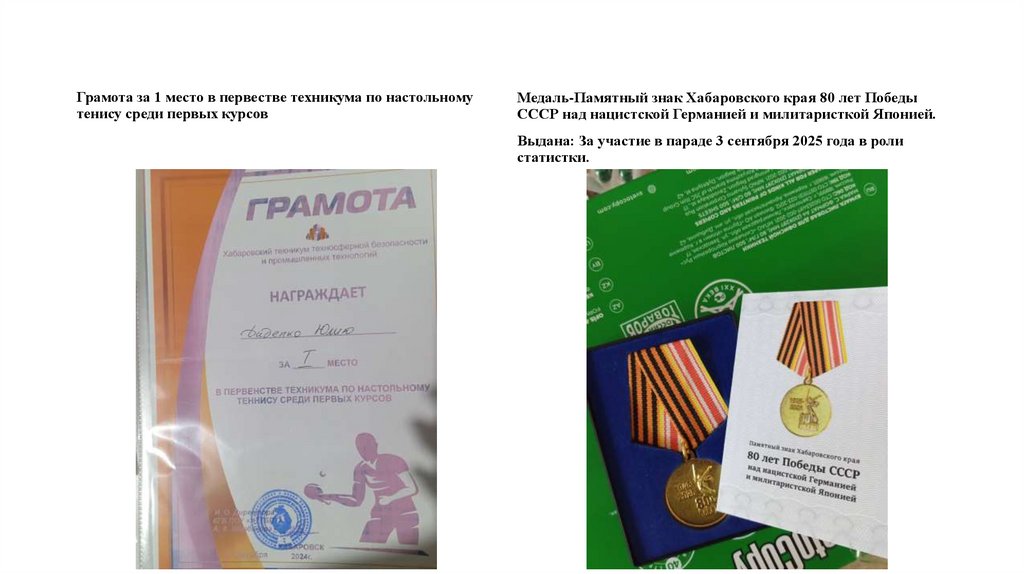 Грамота за 1 место в первестве техникума по настольномутенису среди первых курсов
