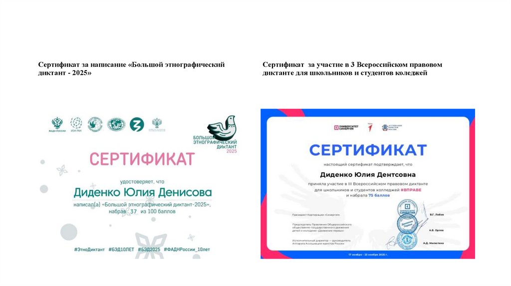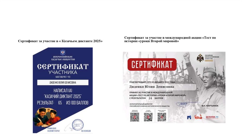 Сертификат за участие в « Казачьем диктанте 2025»Сертификат за участие в международной акции «Тест по