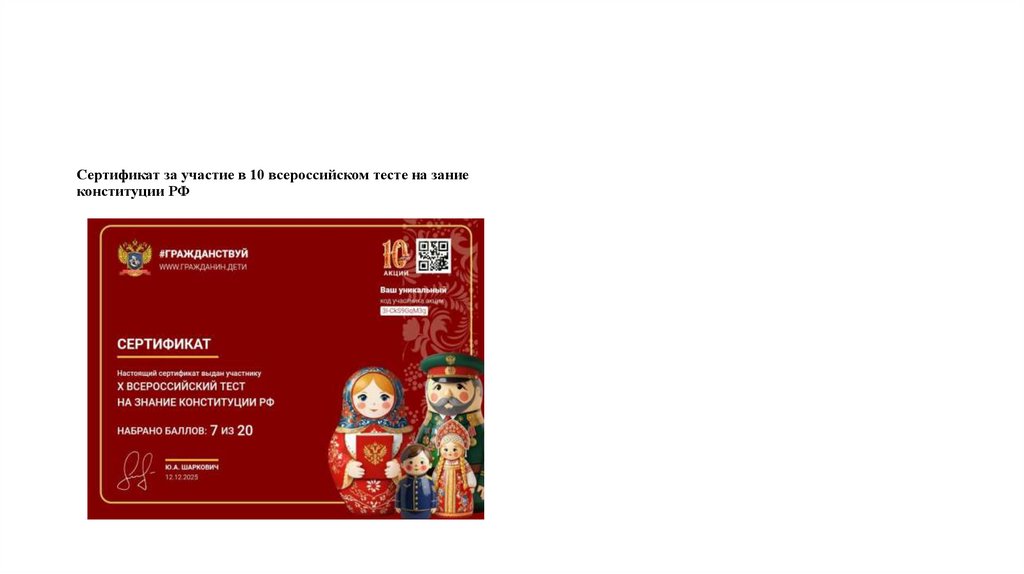 Сертификат за участие в 10 всероссийском тесте на заниеконституции РФ