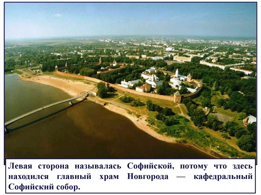 Левая сторона называлась Софийской, потому что здесьнаходился главный храм Новгорода — кафедральный