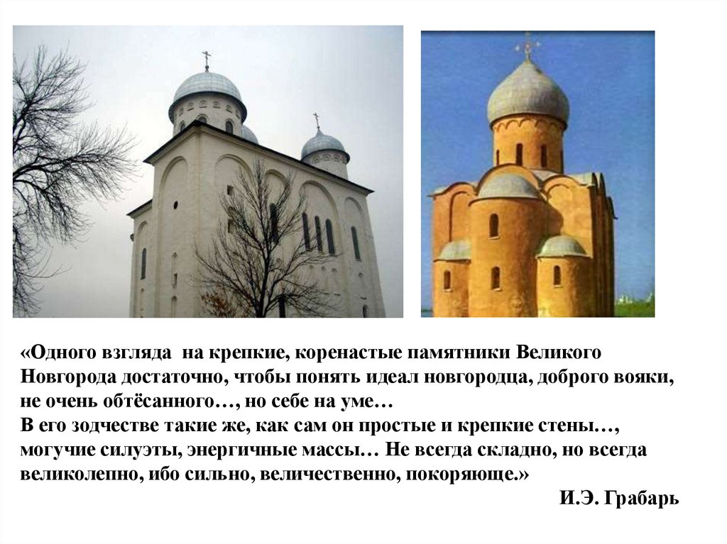 «Одного взгляда на крепкие, коренастые памятники ВеликогоНовгорода достаточно, чтобы понять идеал новгородца, доброго вояки,