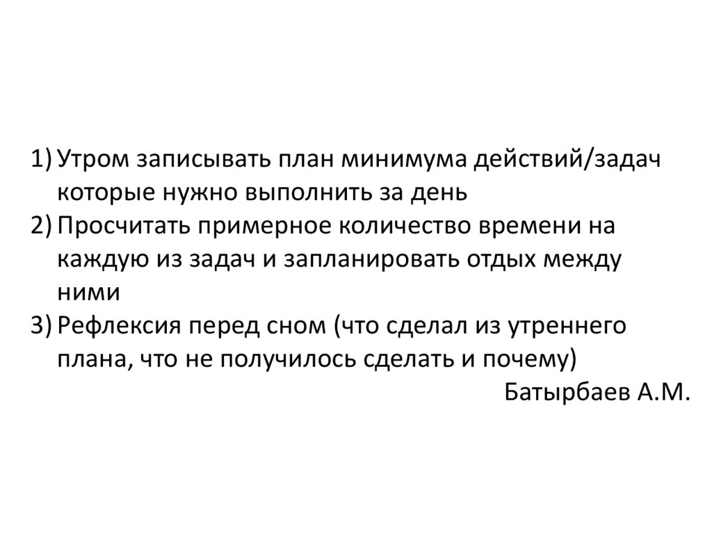 1) Утром записывать план минимума действий/задачкоторые нужно выполнить за день
