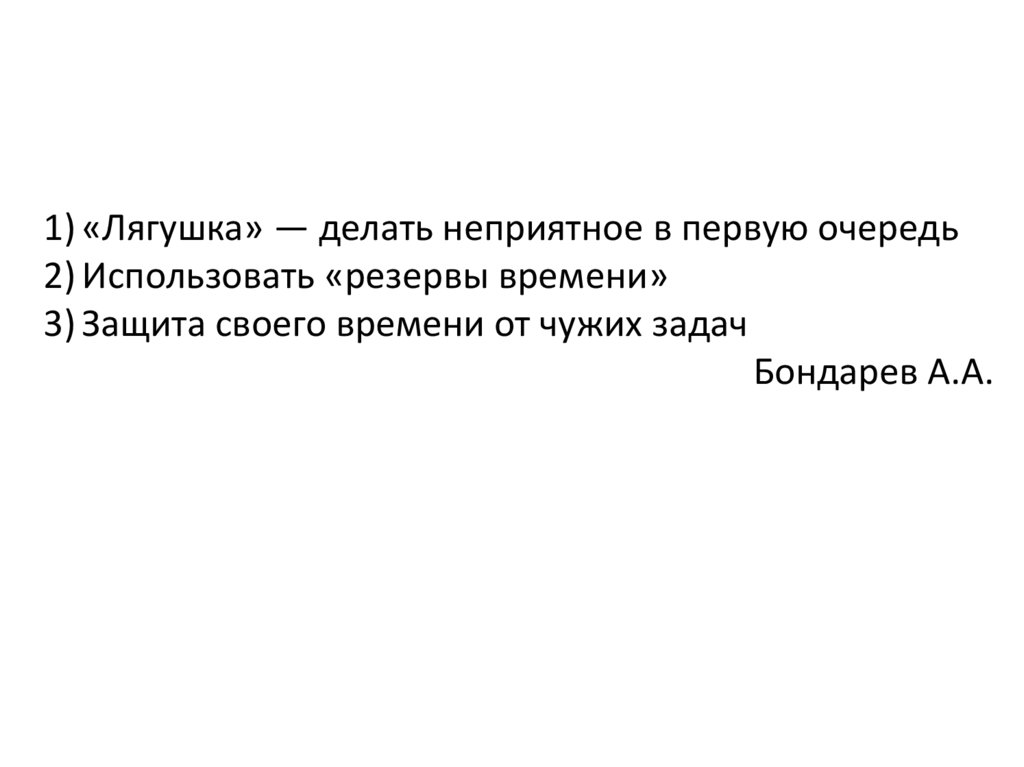 1) «Лягушка» — делать неприятное в первую очередь2) Использовать «резервы времени»