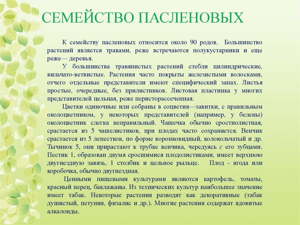 СЕМЕЙСТВО ПАСЛЕНОВЫХК семейству пасленовых относится около 90 родов. Большинство