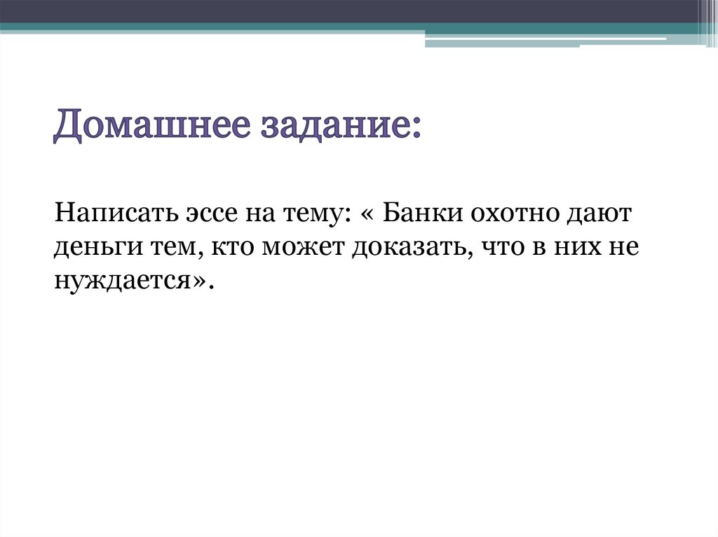 Написать эссе на тему: « Банки охотно даютденьги тем, кто может доказать, что в них не