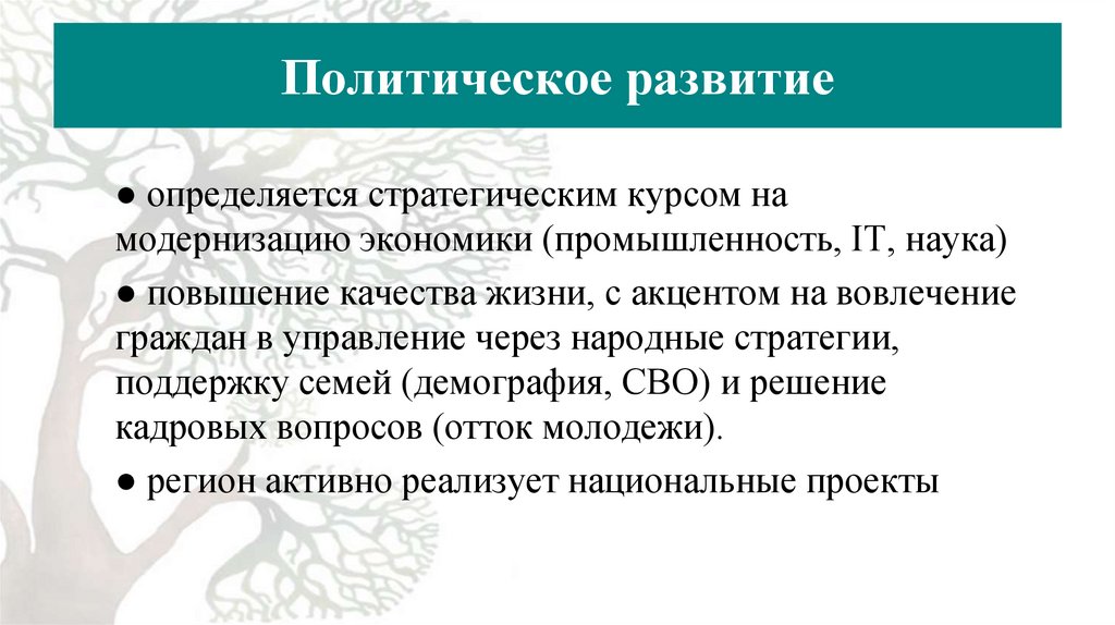 Политическое развитие● определяется стратегическим курсом на