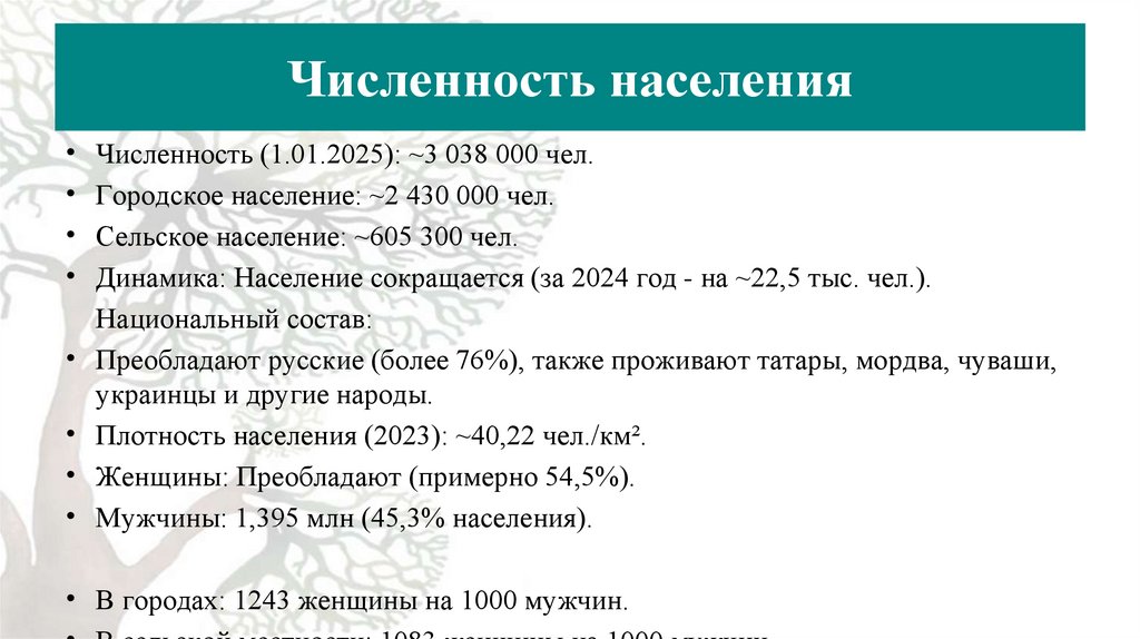 • Динамика: Население сокращается (за 2024 год - на ~22,5 тыс. чел.).