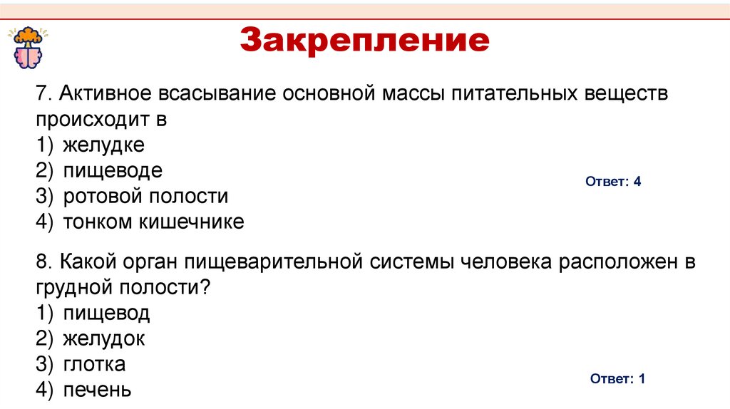 Закрепление7. Активное всасывание основной массы питательных веществ