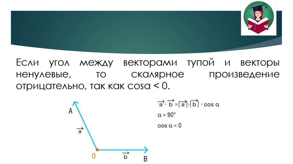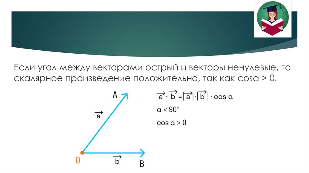 Если угол между векторами острый и векторы ненулевые, тоскалярное произведение положительно, так как cosα > 0.