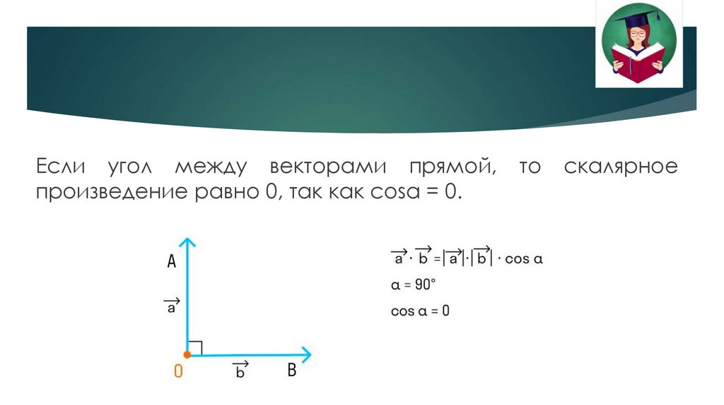 Если угол между векторами прямой,произведение равно 0, так как cosα = 0.