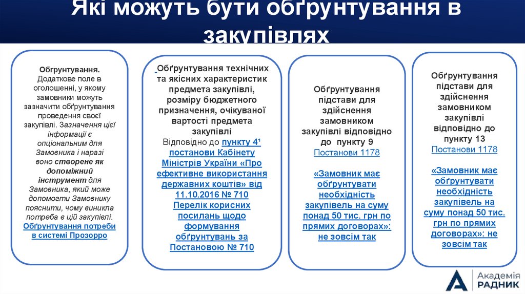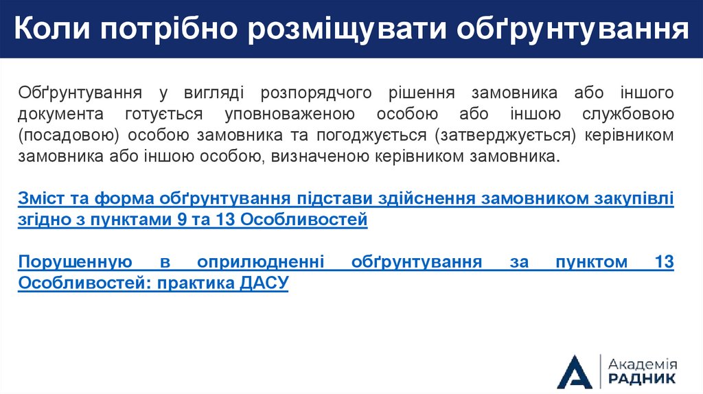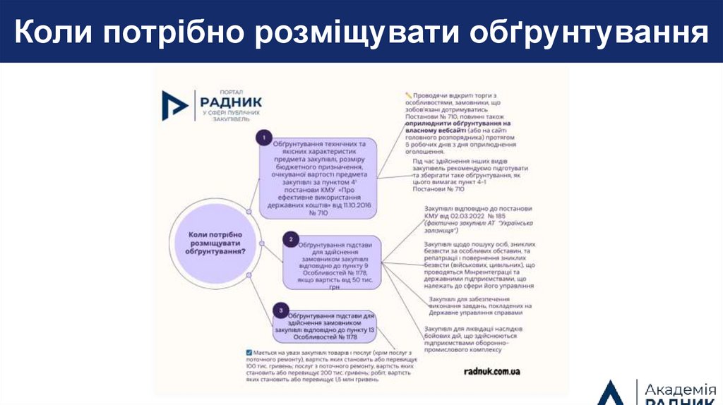 Коли потрібно розміщувати обґрунтування6. Щодо питань із публічних закупівель звертайтеся: Академія Радник +38 (044) 581 09 37 сайт: radnyk.academy Тендерне агентство