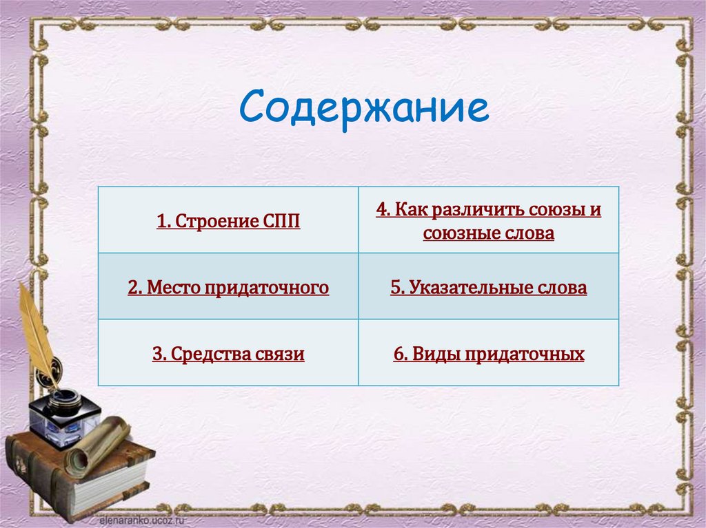 В главном предложении часто бывают указательные слова –это местоимения и наречия. Их функция – указать на наличие