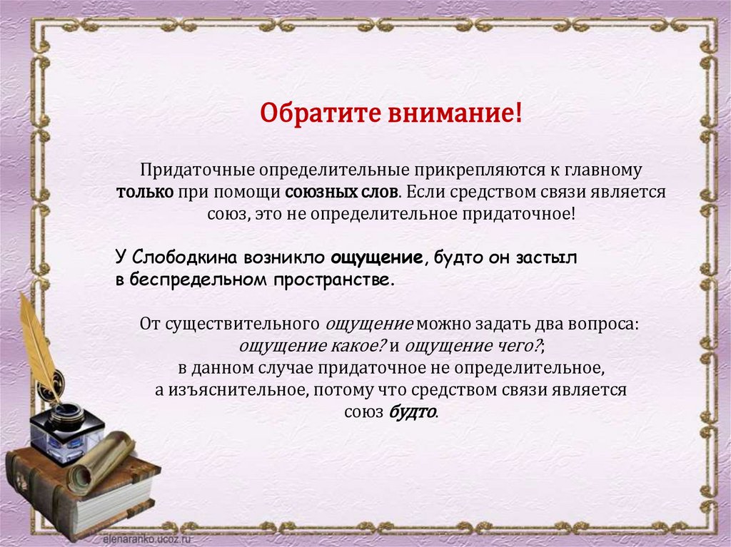 Обратите внимание!Придаточные определительные прикрепляются к главному