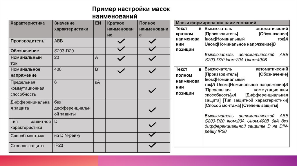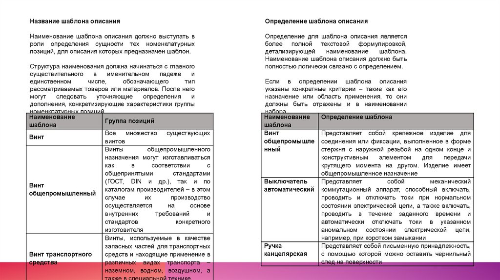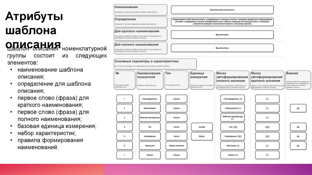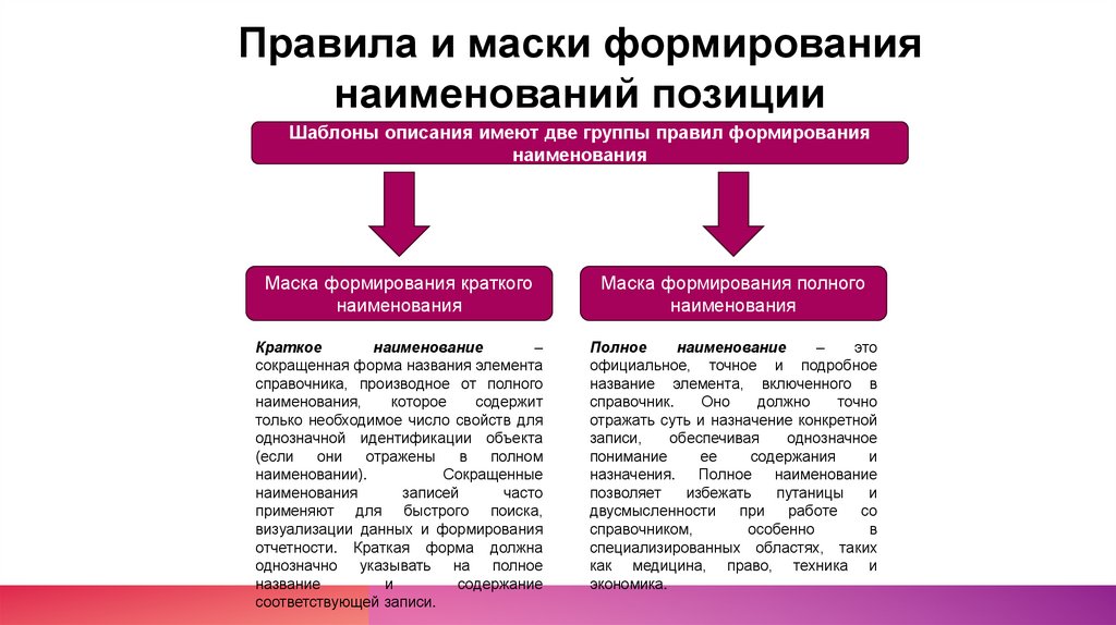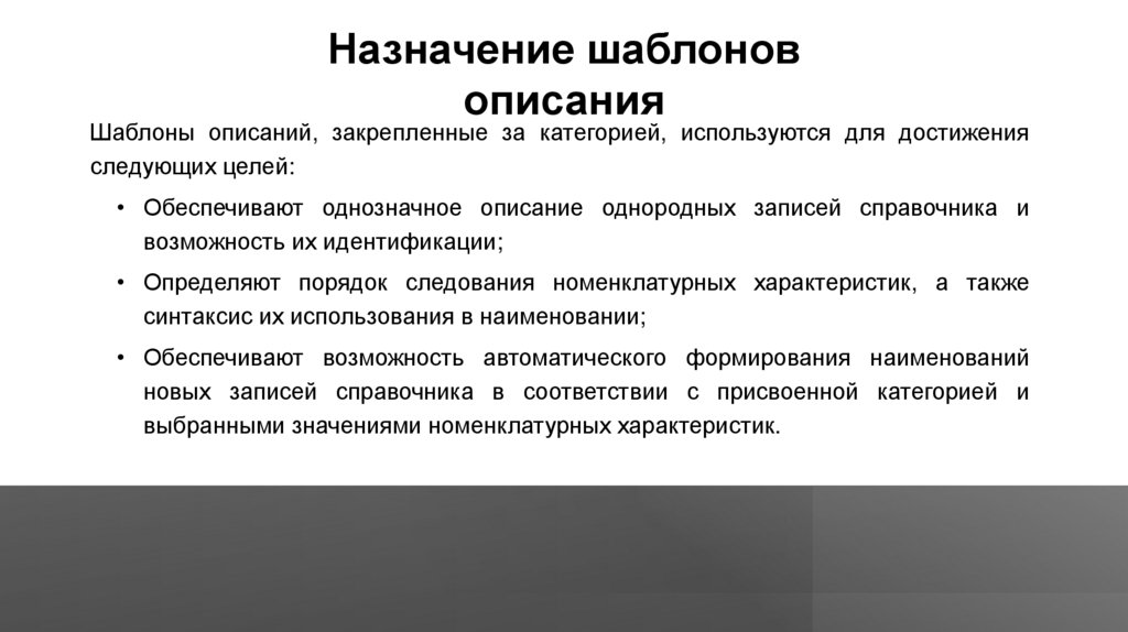 Шаблон описания – это формализованное правило построения наименования записисправочника, которое задает состав и порядок указания значений номенклатурных