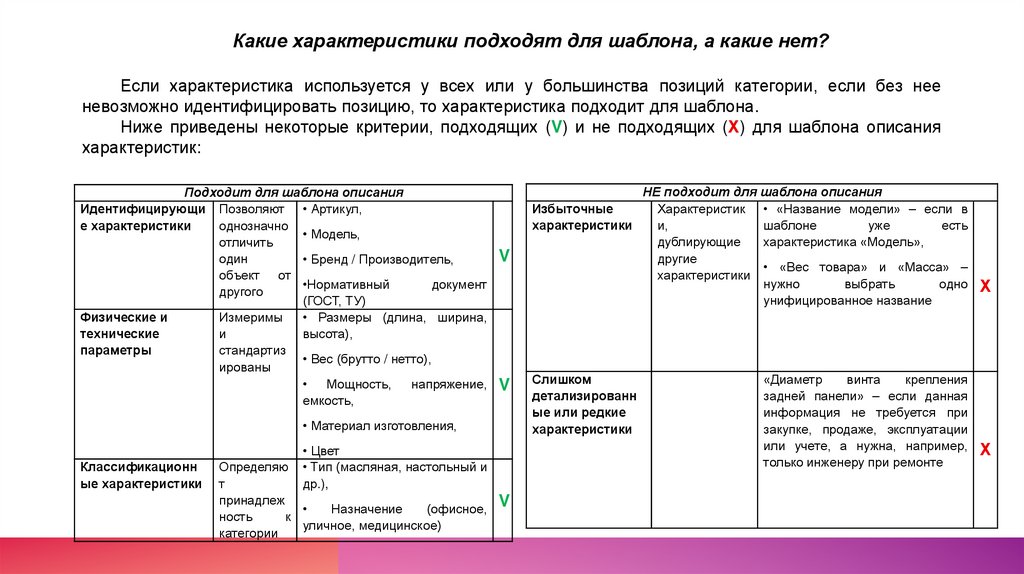 Ниже приведены некоторые критерии, подходящих (V) и не подходящих (Х) для шаблона описания