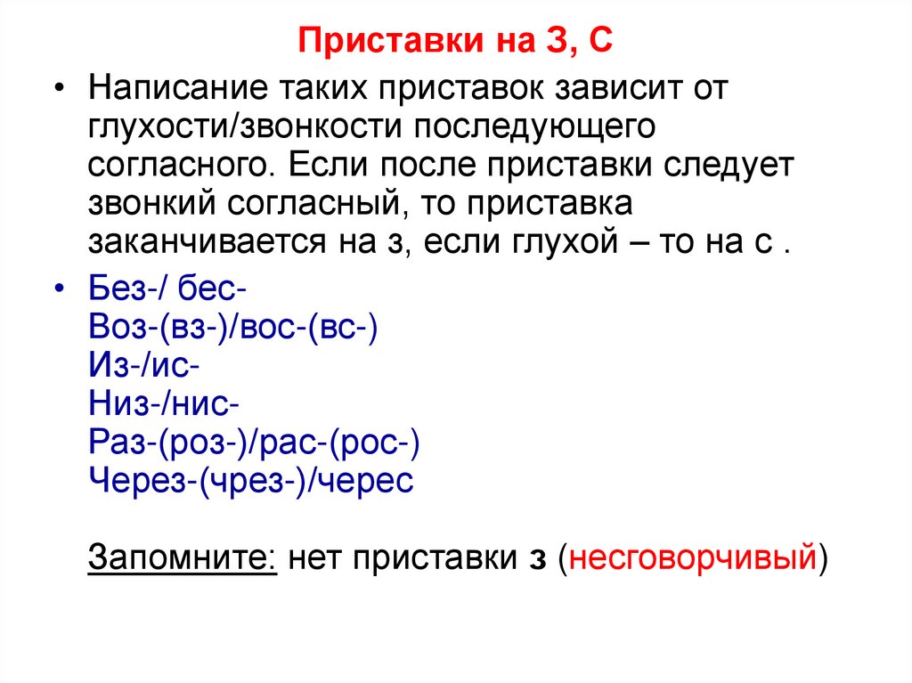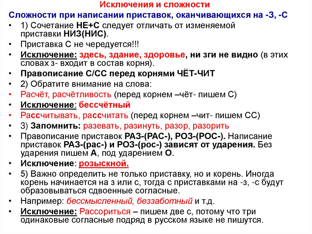 Исключения и сложностиСложности при написании приставок, оканчивающихся на -З, -С
