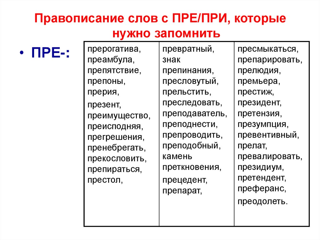 Правописание слов с ПРЕ/ПРИ, которыенужно запомнить