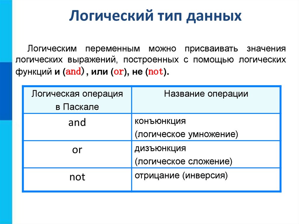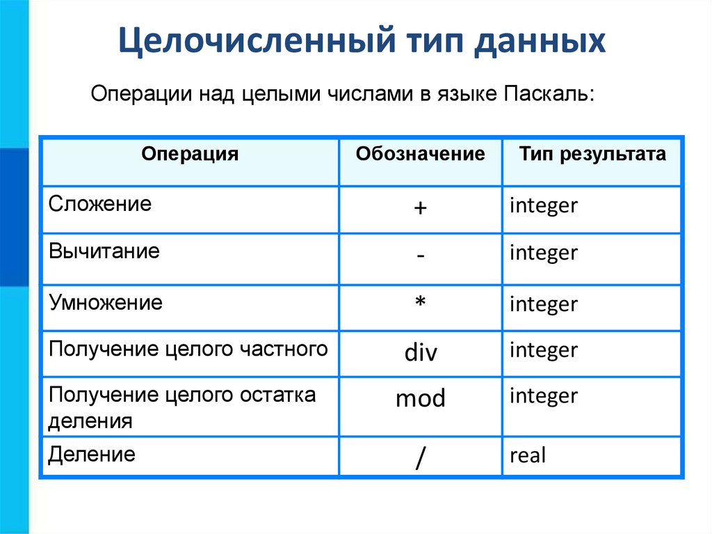 Целочисленный тип данныхОперации над целыми числами в языке Паскаль: