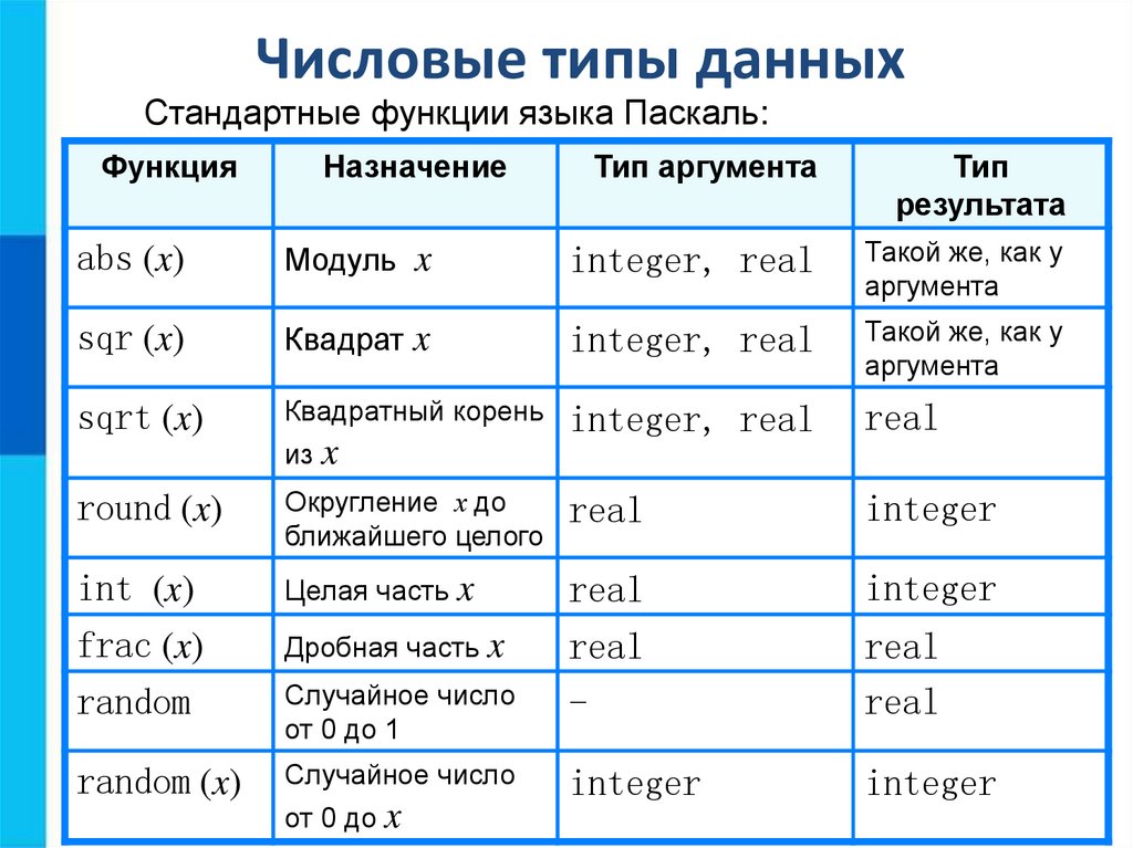 Числовые типы данныхСтандартные функции языка Паскаль: