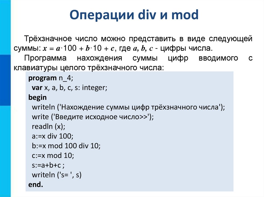 Операции div и modТрёхзначное число можно представить в виде следующей