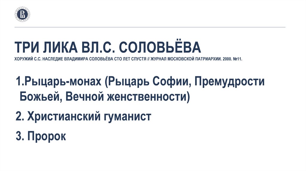 ТРИ ЛИКА ВЛ.С. СОЛОВЬЁВАХОРУЖИЙ С.С. НАСЛЕДИЕ ВЛАДИМИРА СОЛОВЬЁВА СТО ЛЕТ СПУСТЯ // ЖУРНАЛ МОСКОВСКОЙ ПАТРИАРХИИ. 2000. №11.