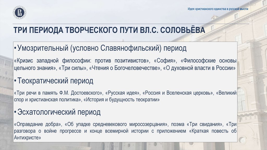 Идея христианского единства в русской мыслиТРИ ПЕРИОДА ТВОРЧЕСКОГО ПУТИ ВЛ.С. СОЛОВЬЁВА