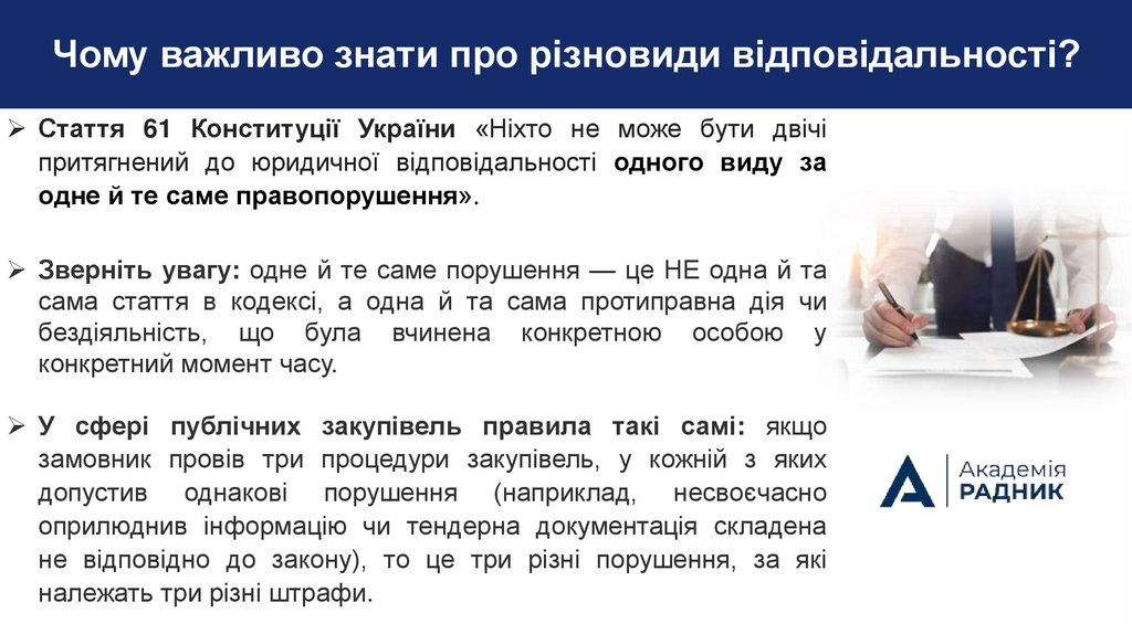 Чому важливо знати про різновиди відповідальності?Стаття 61 Конституції України «Ніхто не може бути двічі
