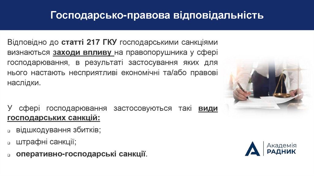 Господарсько-правова відповідальністьВідповідно до статті 217 ГКУ господарськими санкціями