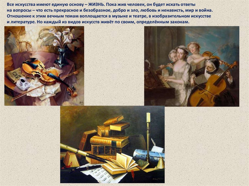 Все искусства имеют единую основу – ЖИЗНЬ. Пока жив человек, он будет искать ответына вопросы – что есть прекрасное и безобразное, добро и зло, любовь и ненависть, мир и война.