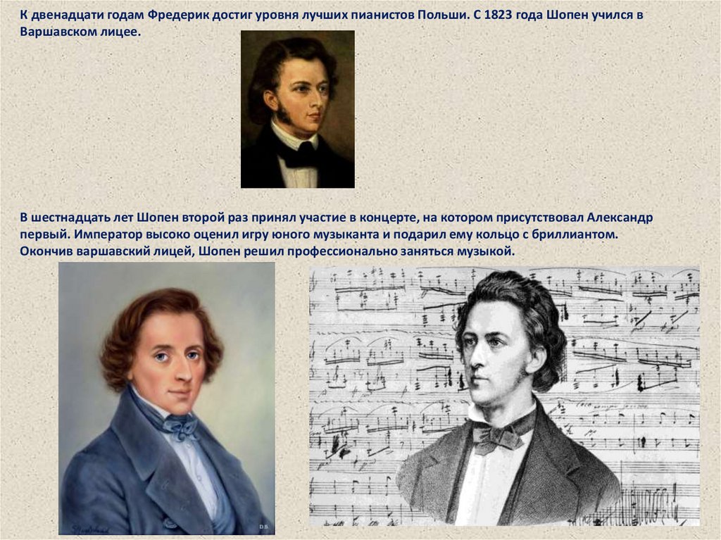 К двенадцати годам Фредерик достиг уровня лучших пианистов Польши. С 1823 года Шопен учился вВаршавском лицее.